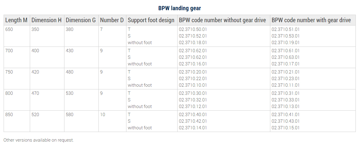 You can find information about and code numbers for support feet, crank handle and connection shaft in the flyer “BPW landing gears”.